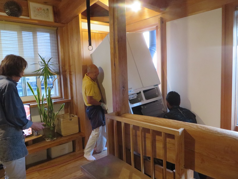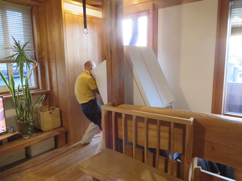 冷蔵庫が壊れたので、新しく購入したのですが、2階まで持ち上げる予定の筈が、階段に手すりがあるので運べないと言われてしまいました。そこで、当社の大工数名を応援に呼ぶと、手摺があってもちゃんと運び込むことが出来ました。