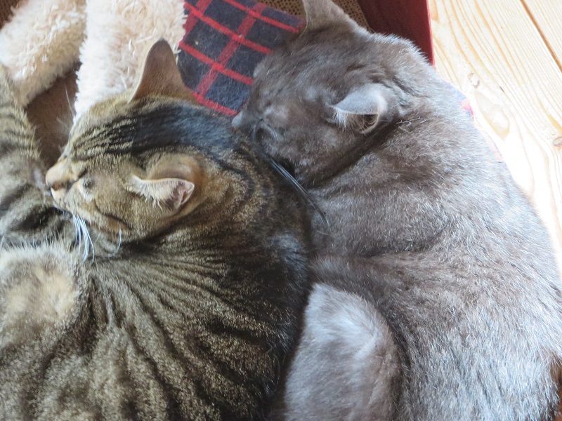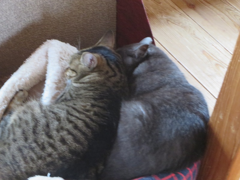 朝から仲良く寝ている猫と仲間に入れずいじけている猫です。