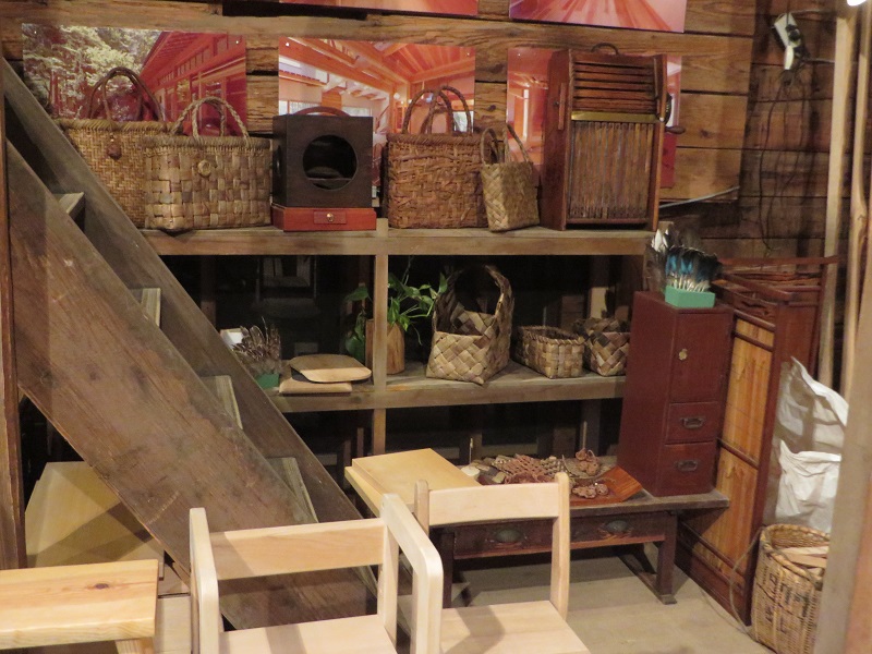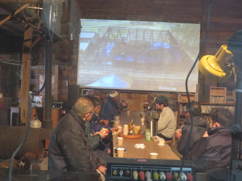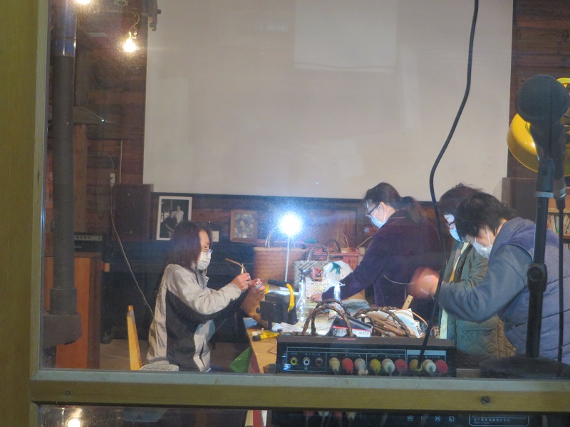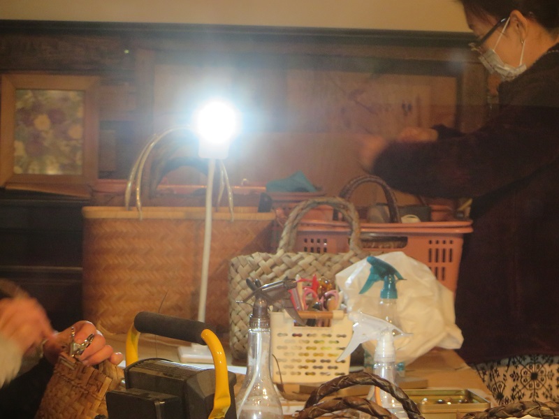 コロナ感染症予防対策で、ワークショップは開催されていませんが、有志が集まり樹皮籠造りをしていました。