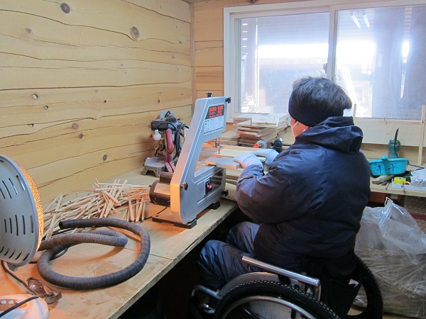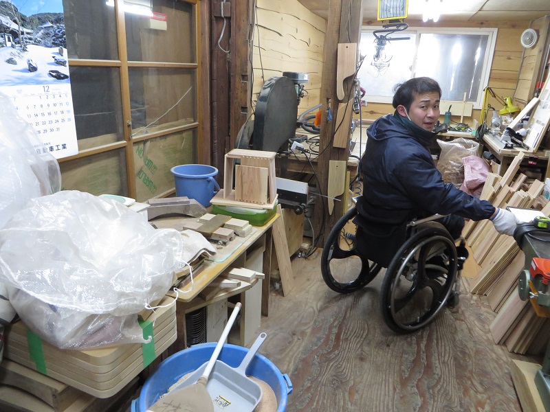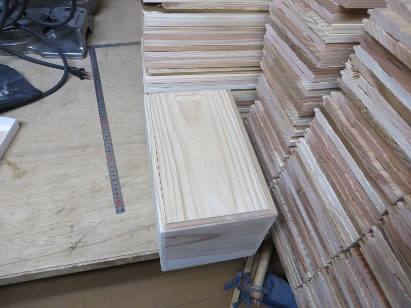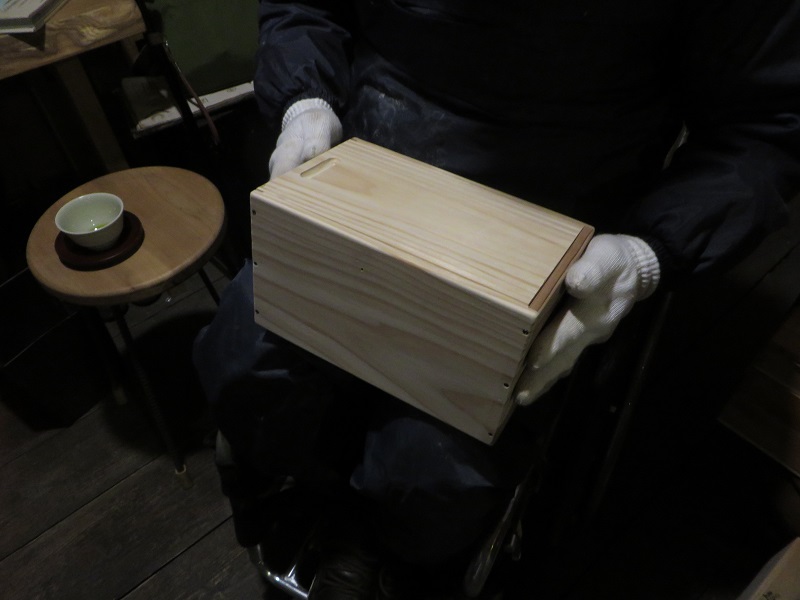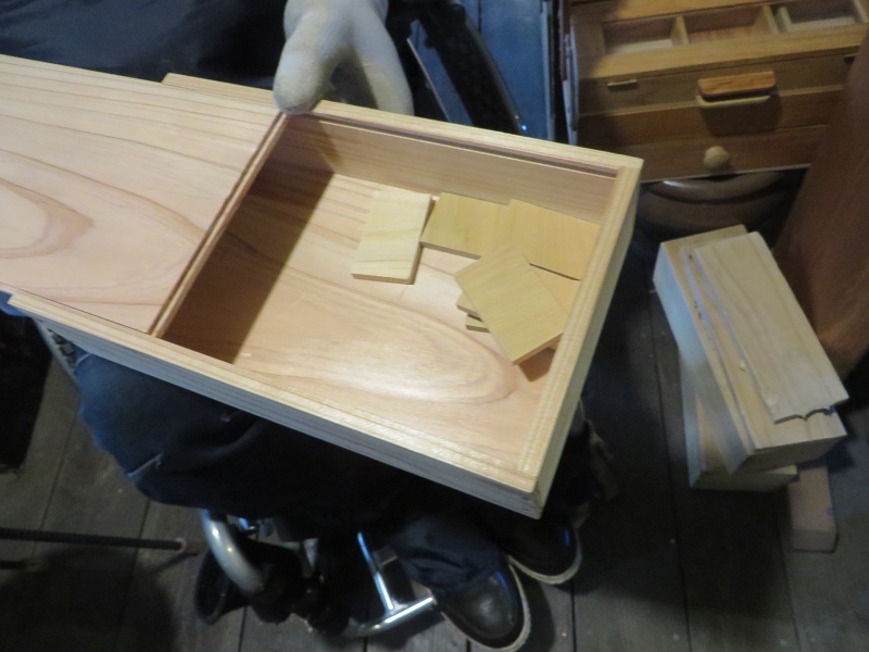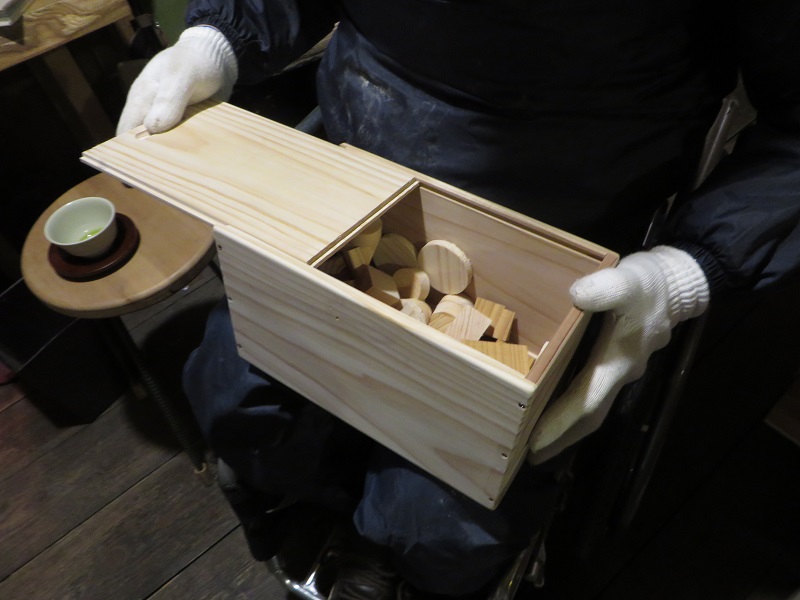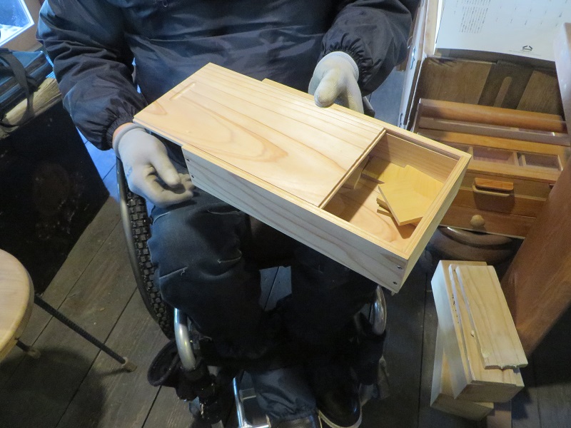 木の玩具として、小さな端材を入れる箱を車椅子大工が造りました。木のお店に置いて販売したいと思います。