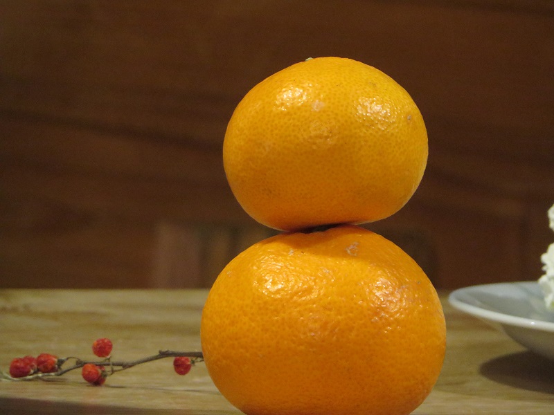 雪だるまならぬ、目と口に見えるミカンだるまです。