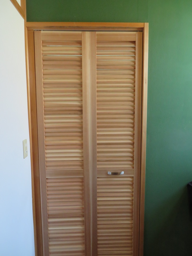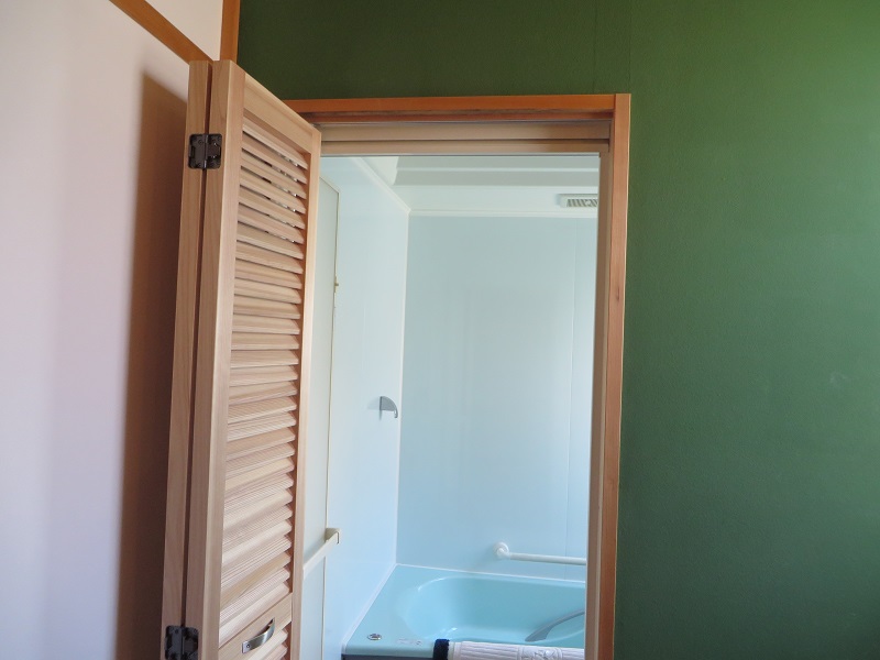 ユニットバスの入り口ドアを木製建具に取りける工事をさせていただきました。