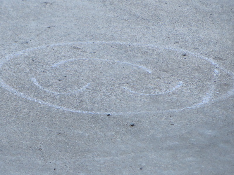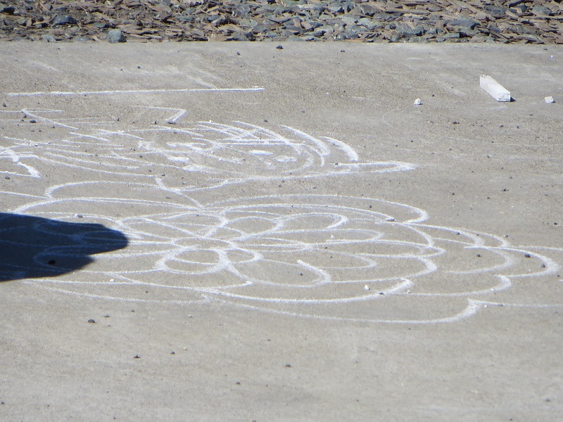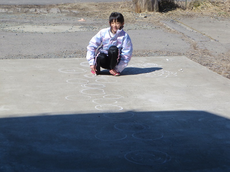 日曜日の犬の世話に必ずついて来る孫が車椅子大工の駐車場に落書きをしていました。