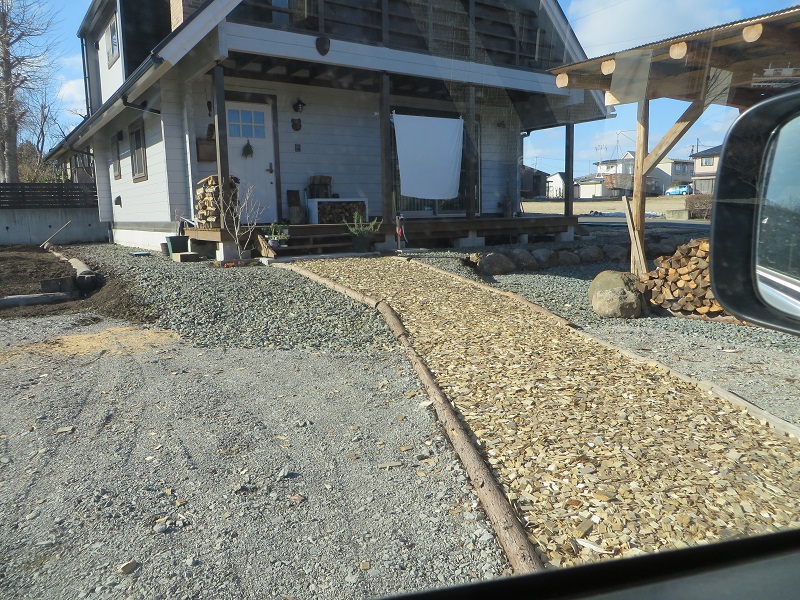 お客様が、ご自身で木の枝を並べてウッドチップを敷き並べ直ししてありました。