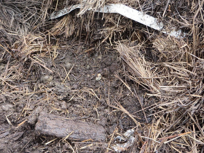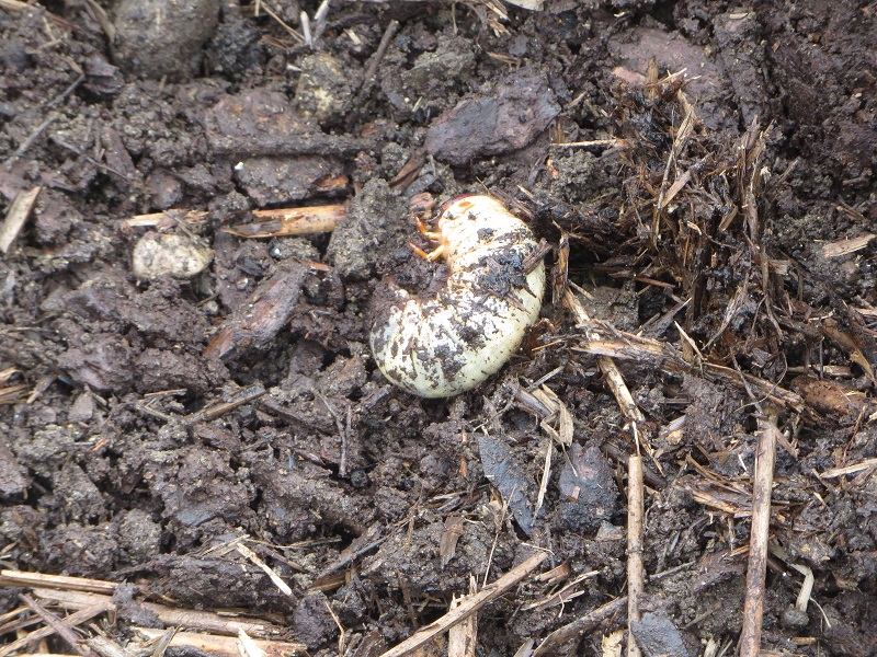 昨年解体して当社場内に取り置いている茅葺き屋根の茅の中にカブトムシの幼虫がたくさんいます。今年の夏にはカブト虫が大量発生するかもしれません。でも烏が狙っています。