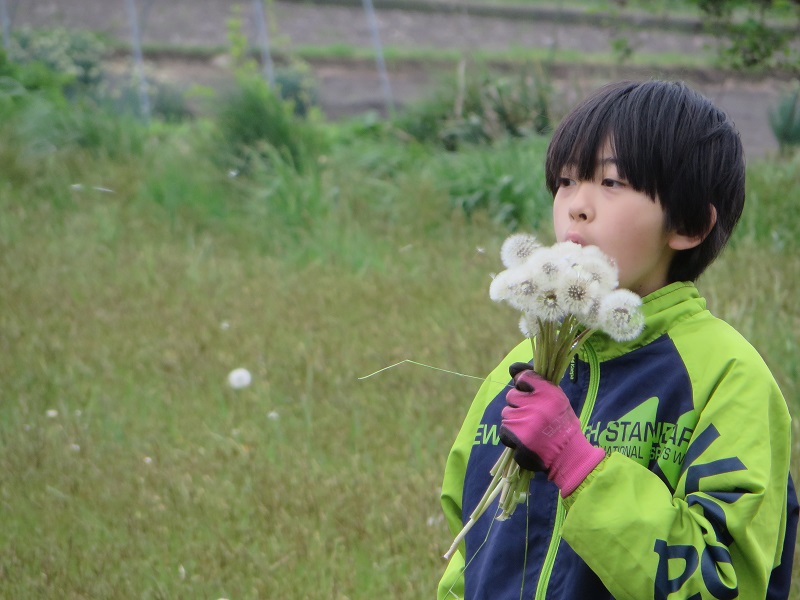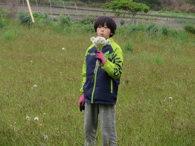 子供は蒲公英の種飛ばしが大好きです。フーフーやってます。