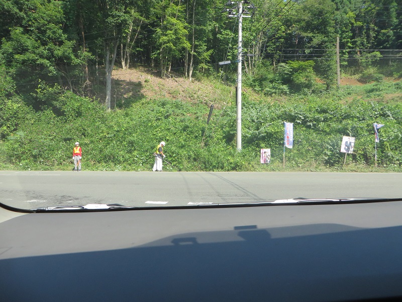 このくそ暑い日に、公共道路では草刈りに従事する方々が頑張って下さっています。