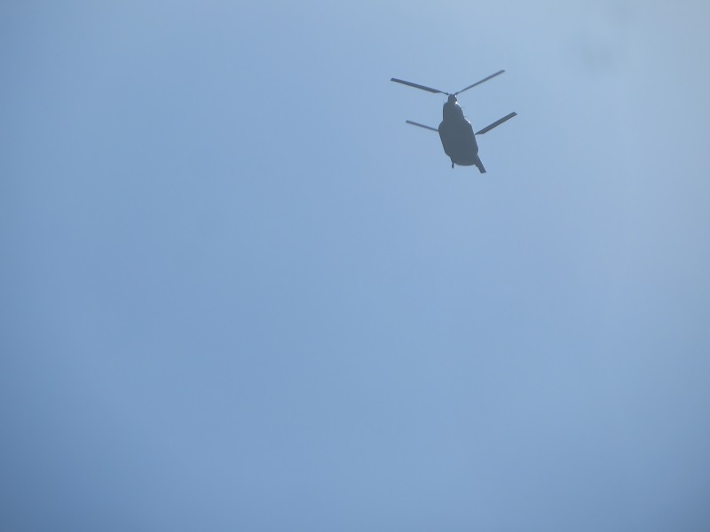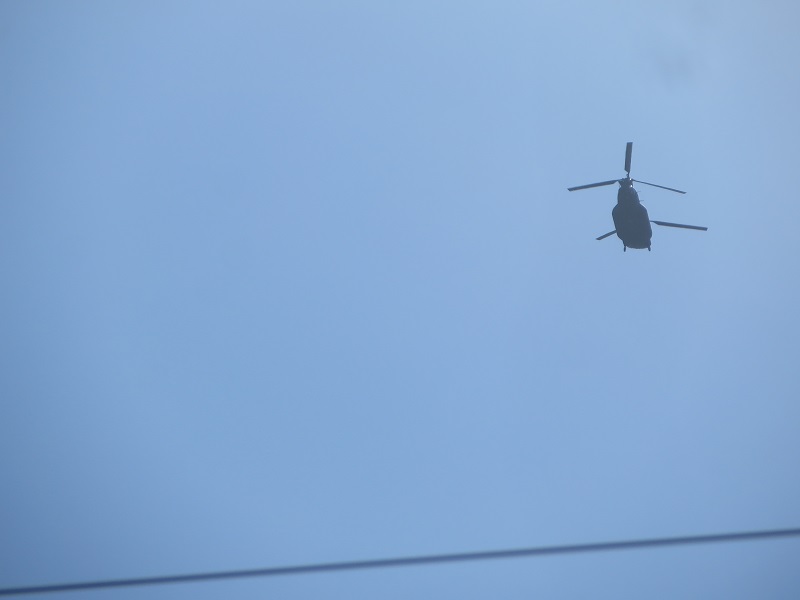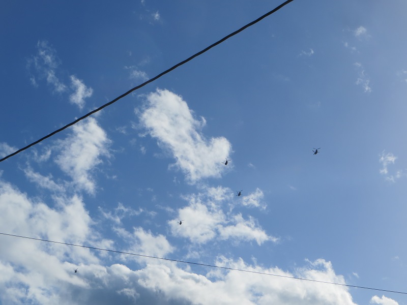 地震かと思うほど爆音と共に建物が揺れるので、何だと思って外に出てみるとヘリコプターの編隊が飛んでいました。