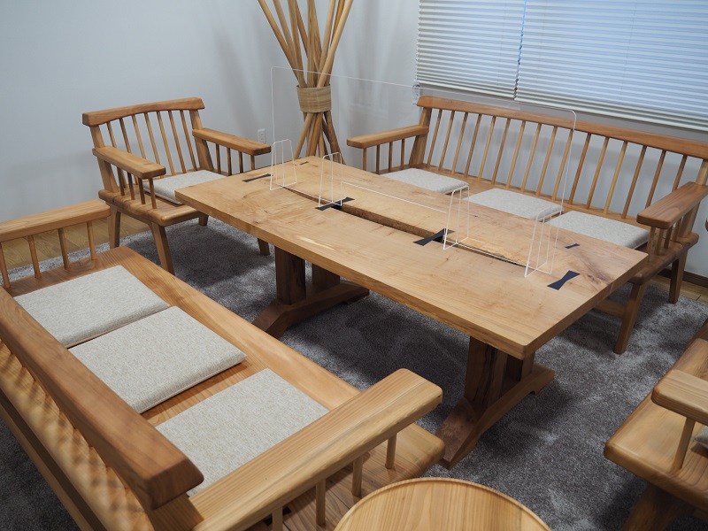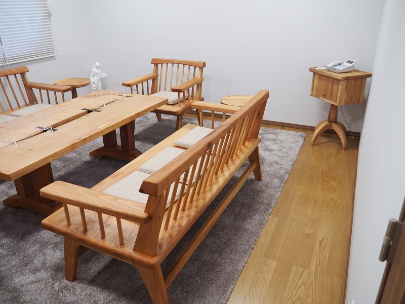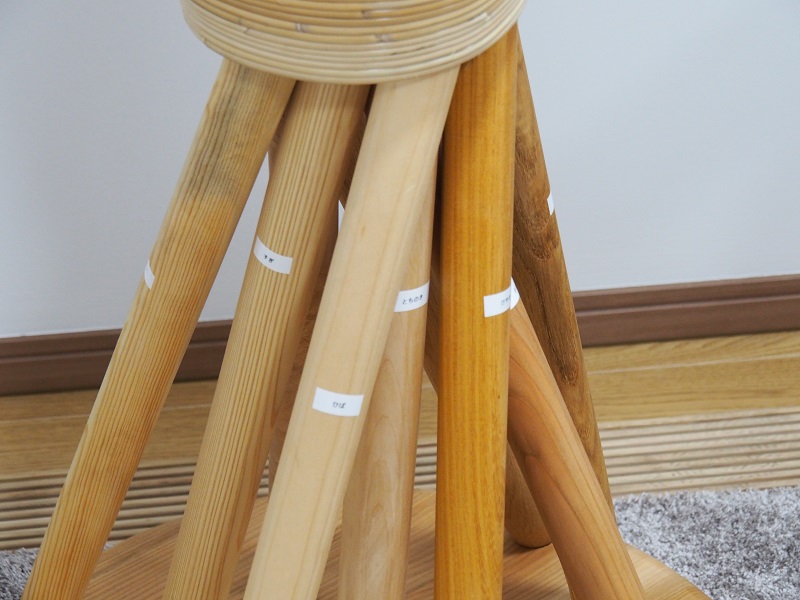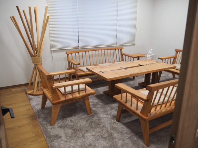 応接セットのコート掛けは十種の樹木で造らせて頂きましたので、どれが何の木かシールを貼って来ました。