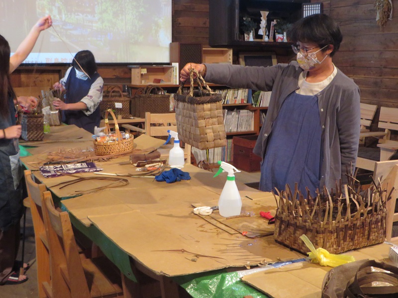 毎週の樹皮編みカゴ造りは盛況です。マイバック二個目の方もいらっしゃいます。
