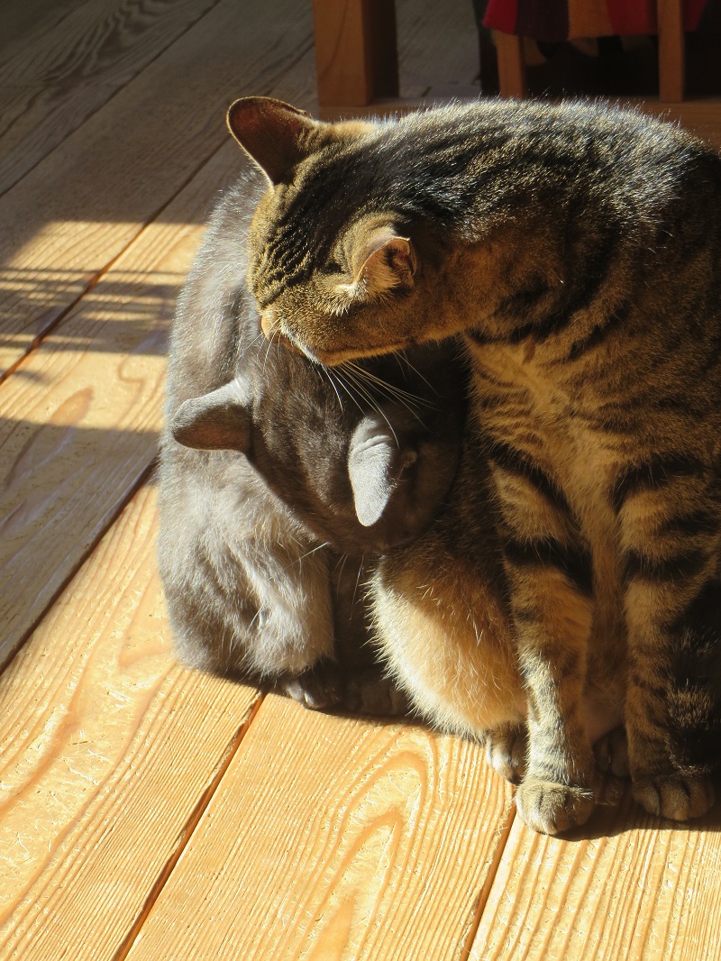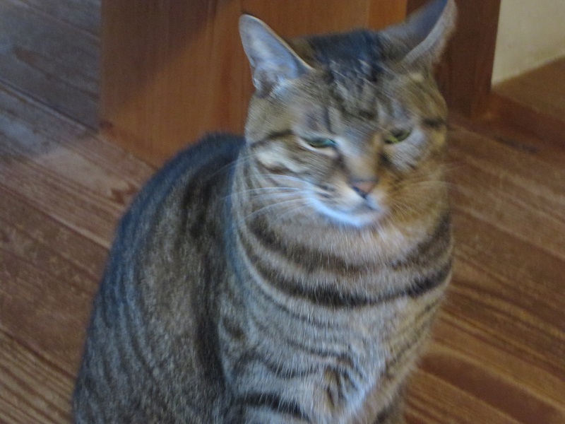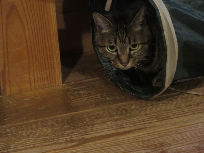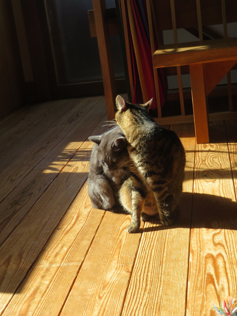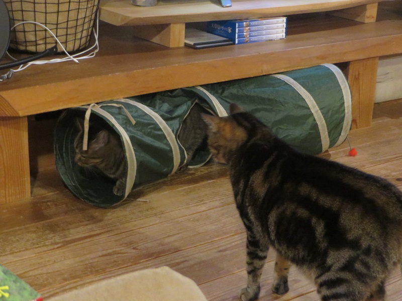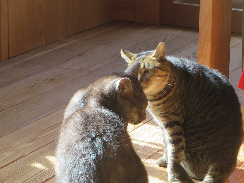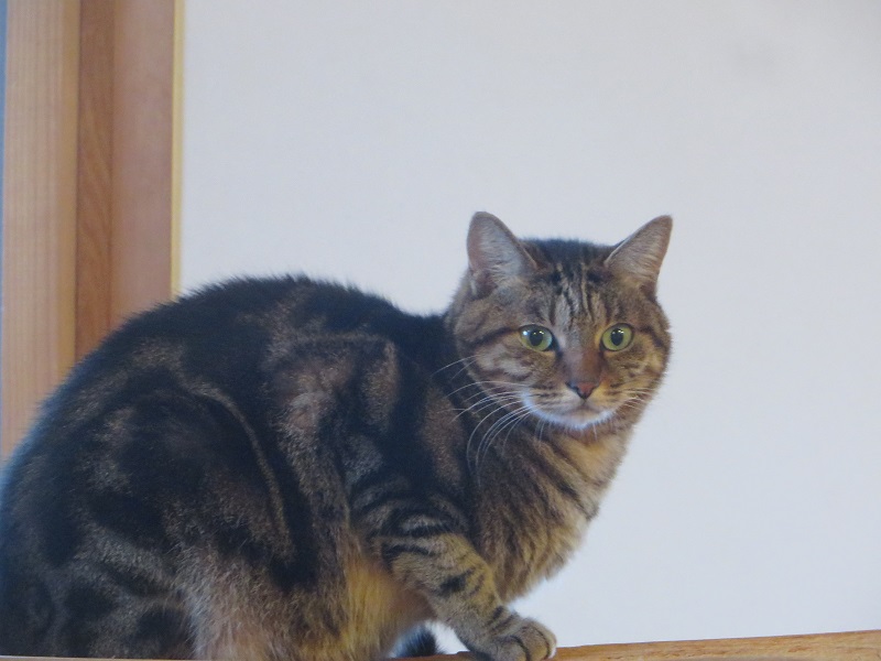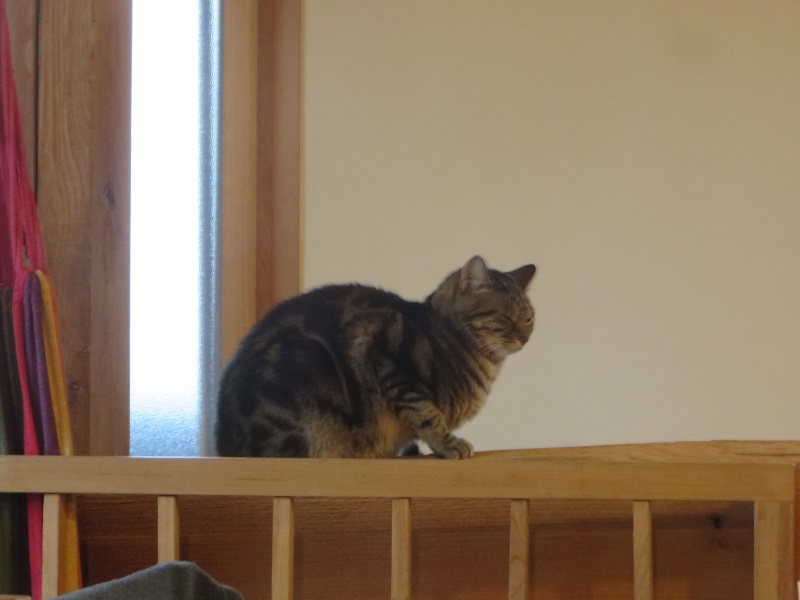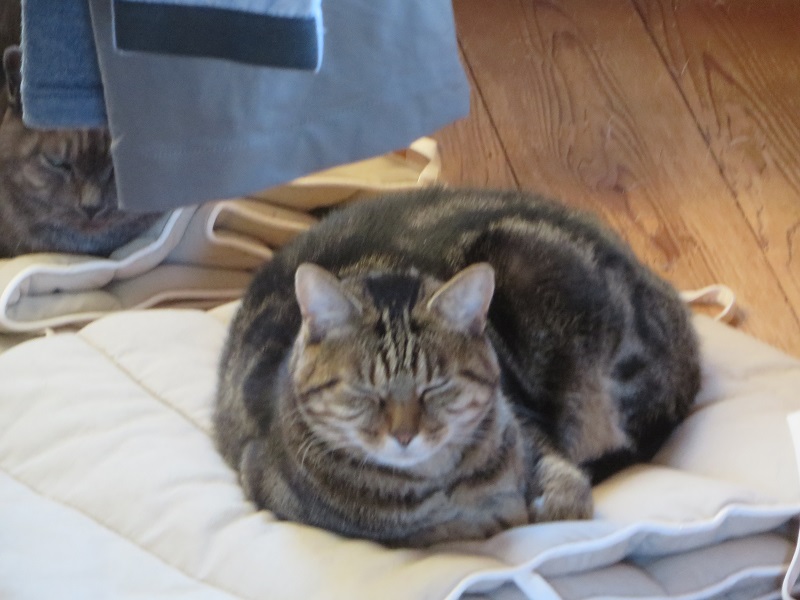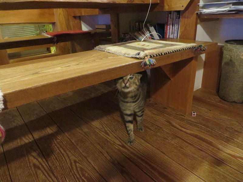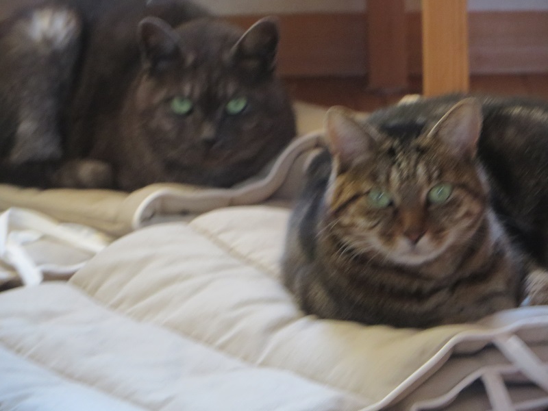 上のカウンターから座布団を自分で降ろして居場所を造る猫たちに驚きです。