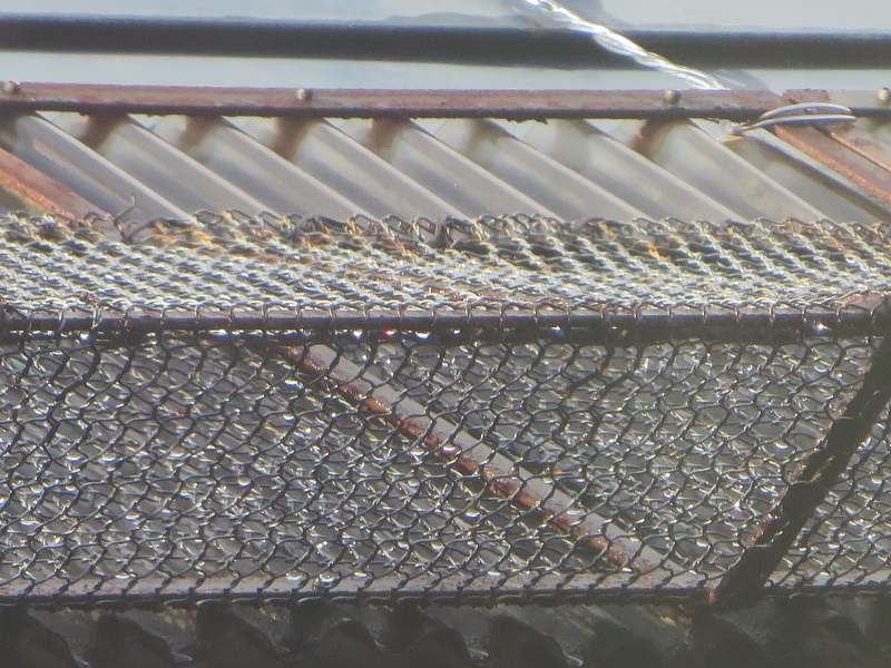 今朝の雨で濡れた雪止めの雫に太陽が差し込んで虹色に輝ていました。