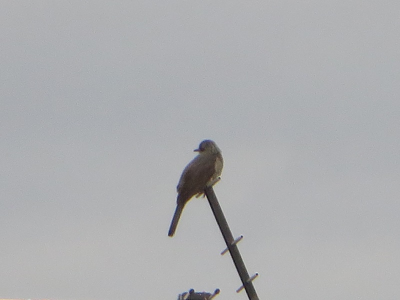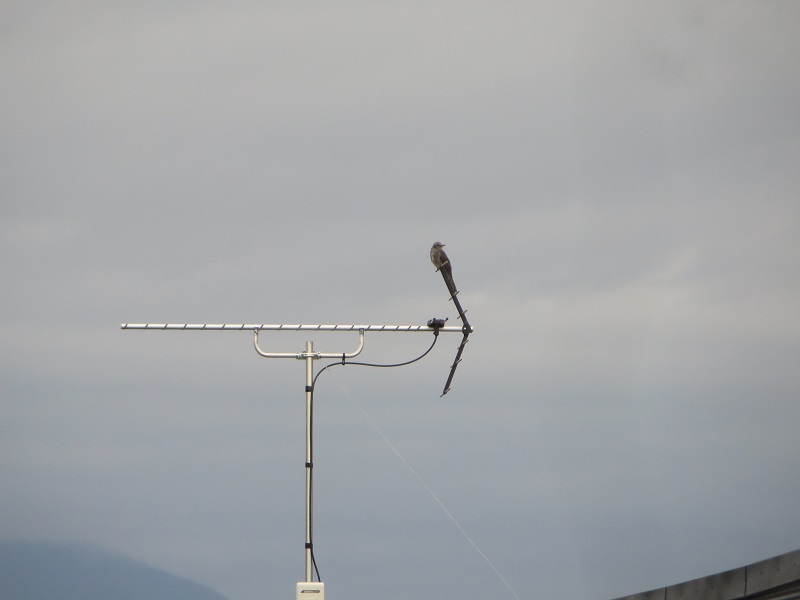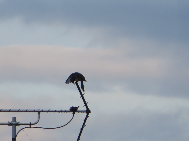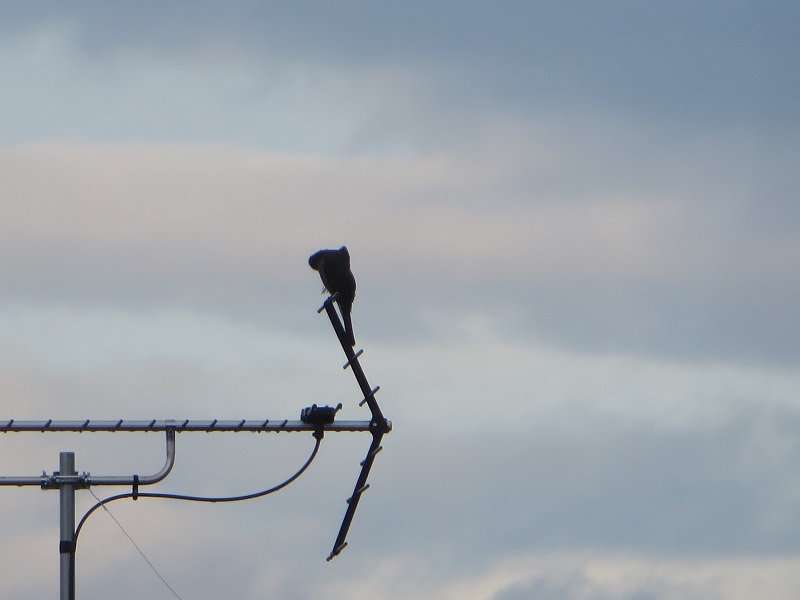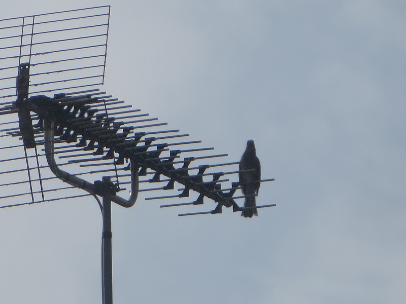 自宅の窓からテレビアンテナを止り木にする鳥たちの様子が見えます。