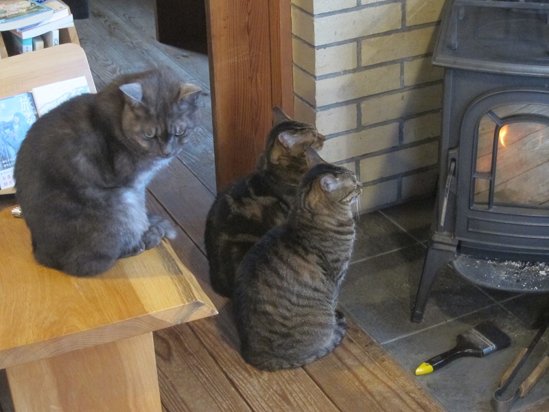この時期は特段寒くなくても薪ストーブ周りに集まって来る猫たちです。