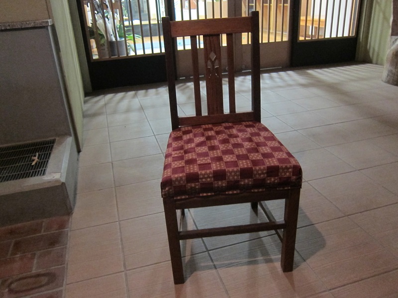 母が入所している施設から、母用に脚の短い椅子の準備を依頼されて、古民具再生家具の中から良さそうな椅子を選んで足を5㎝詰めて届けてみました。座面の生地は着物のリメイクです。