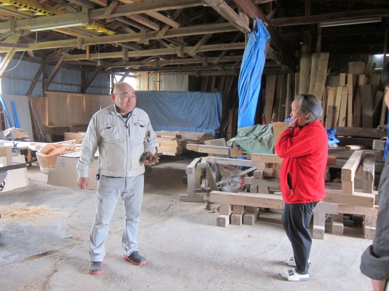 構造材の手刻みを見学に来たお客様と家具職人がバレーボールでの知り合いだったようです。