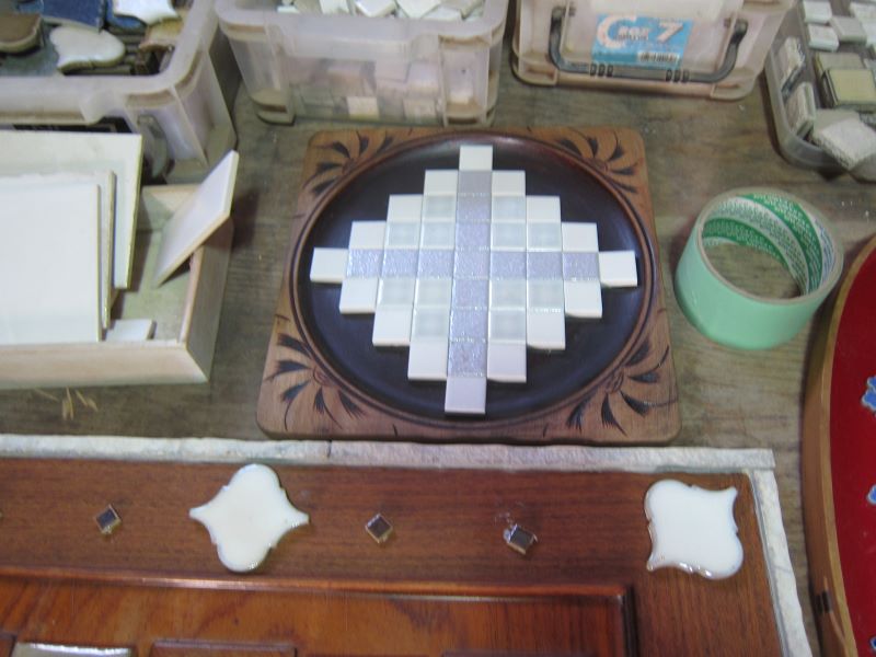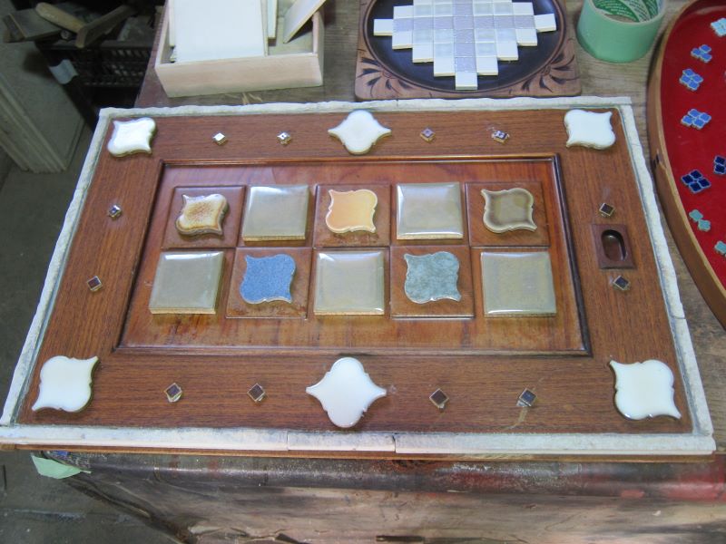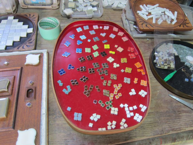 葉材のタイルで飾り絵を作っています。中には花子タイルと言う面白いものもあります。