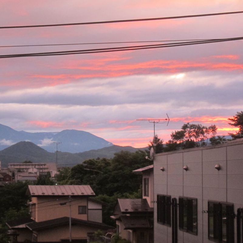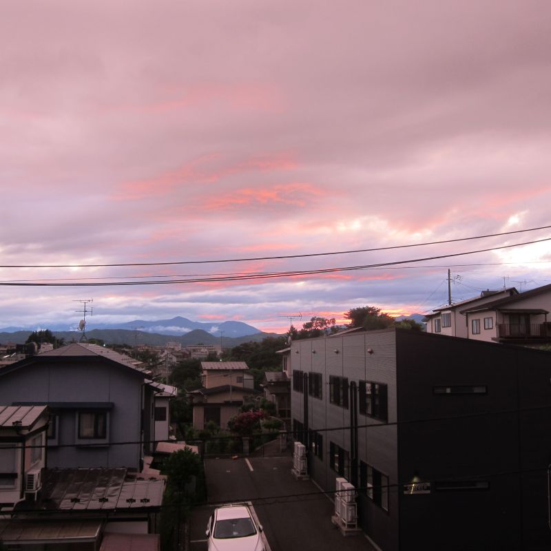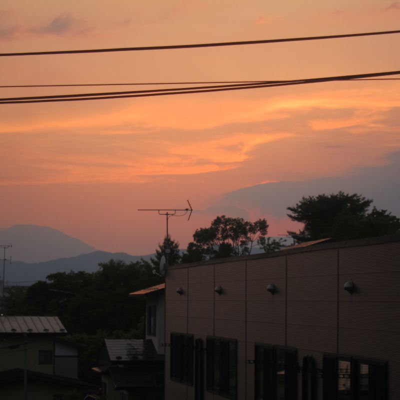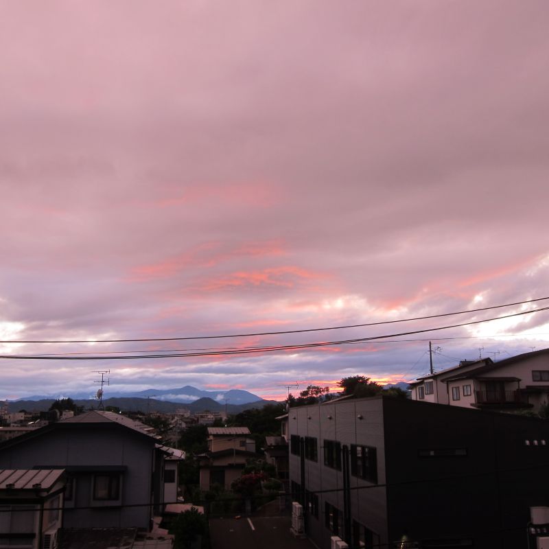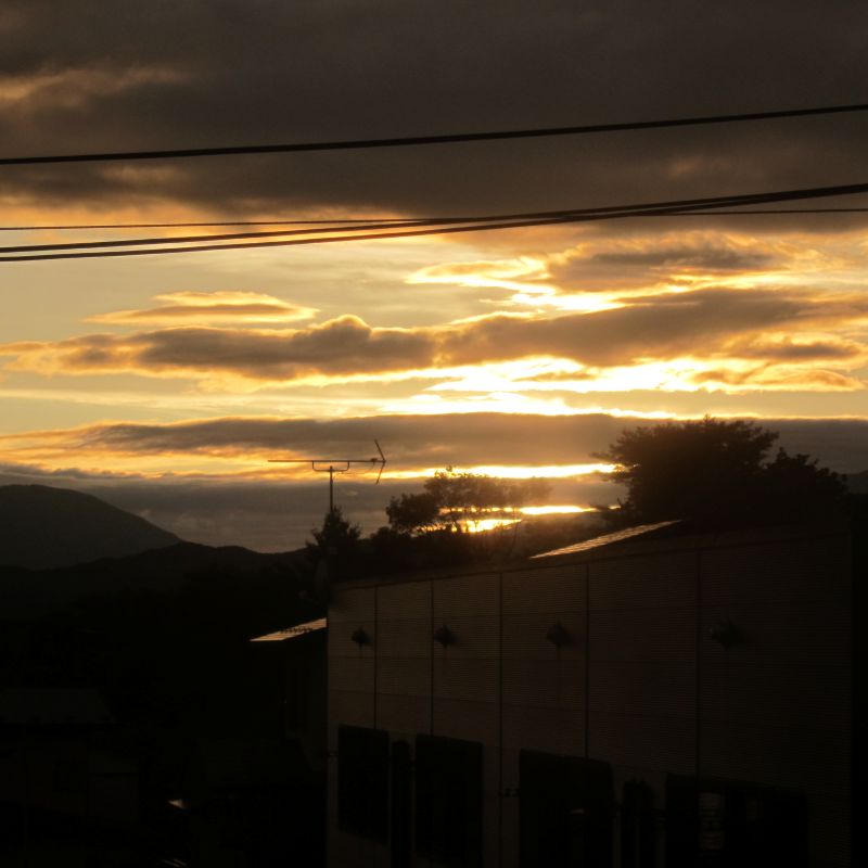 西の窓眩しくてカーテンを下ろしても尚、夕日が差し込んできます。まん丸ですね。
