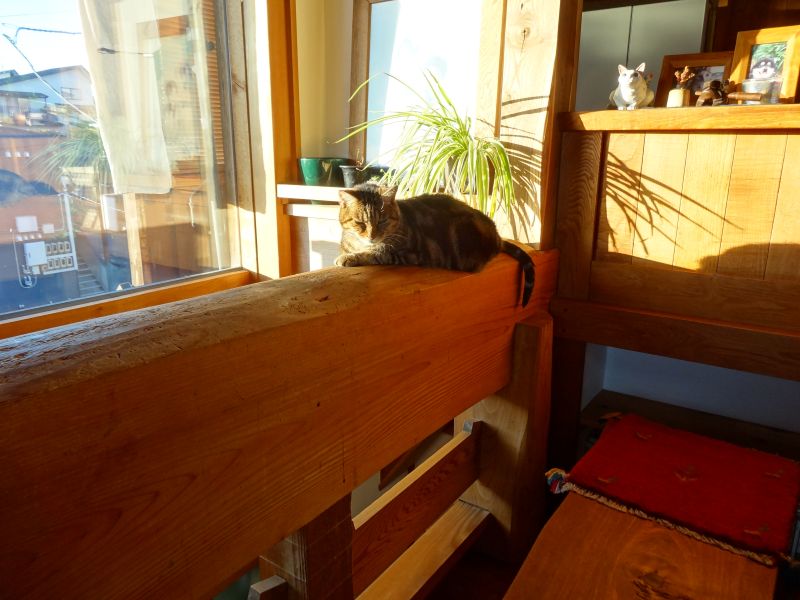夕日差す梁にたたずむ猫です。暖かいのだと思います。