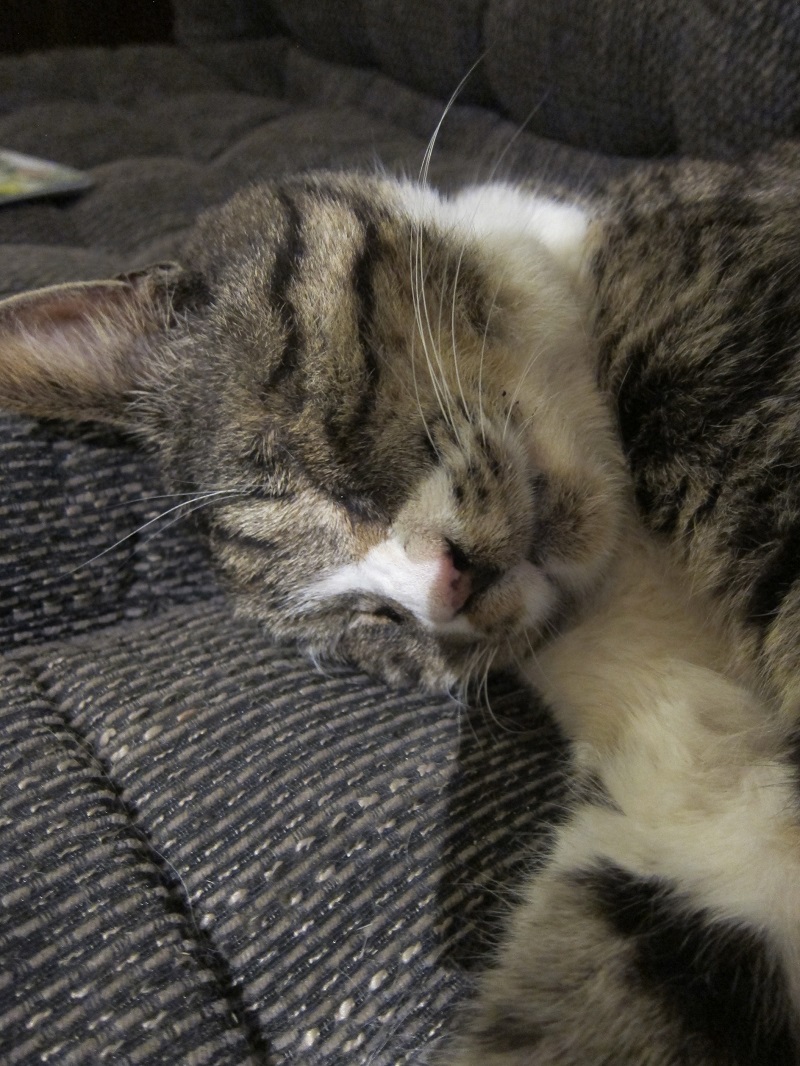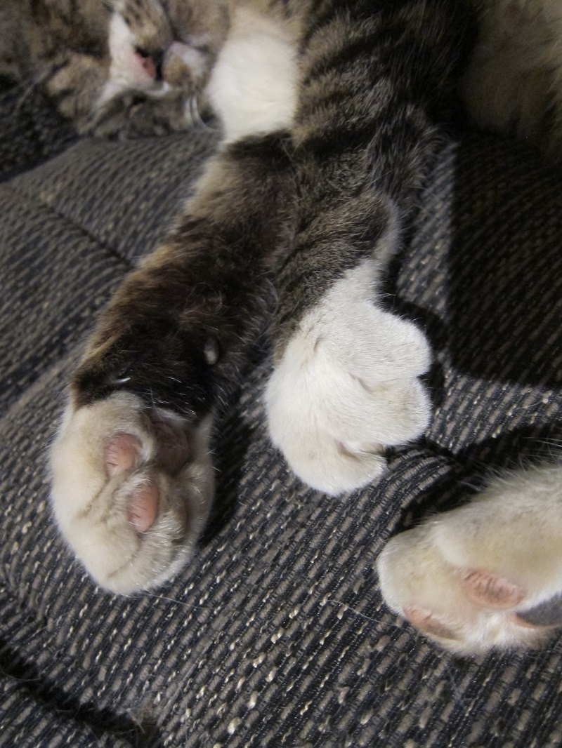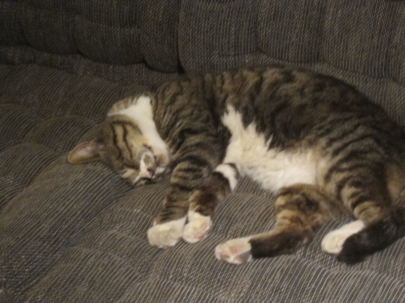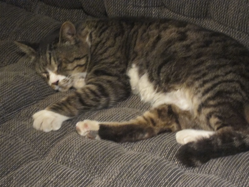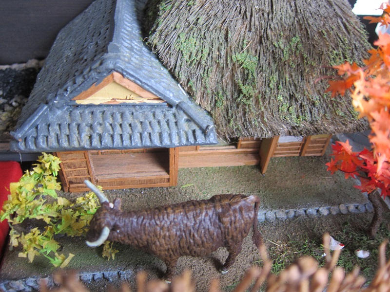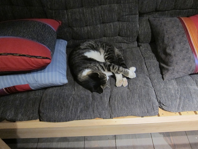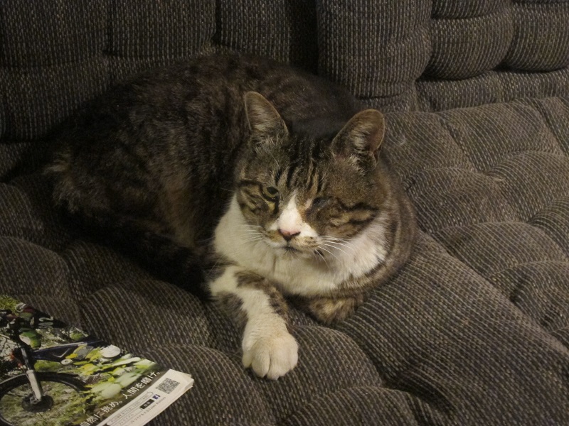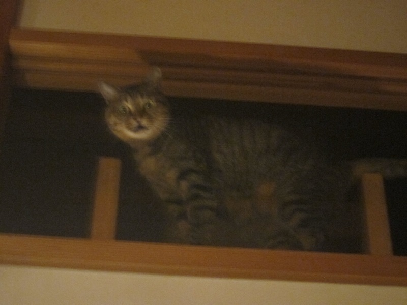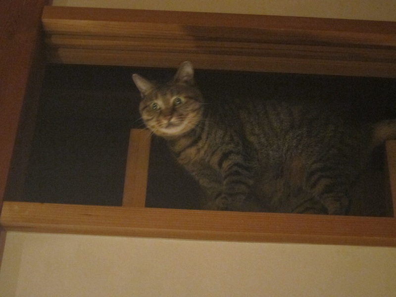 夕日差す梁にたたずむ猫です。暖かいのだと思います。