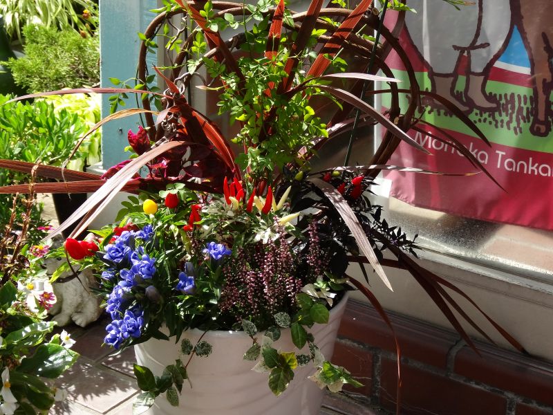 玉山の美味しいレストランのラックスさんをご紹介します。店舗入り口に、木の店で行われたお花教室の寄せ植えが飾られていました。教室に参加した方のプレゼントだそうです。