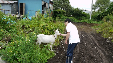 台風一過でやっと外に出れた山羊たちです。ユキちゃんはこうして撫でてあげると、嬉しそうにしてます。