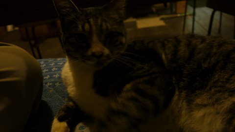 雨が降ると、ガラス戸の前でお座りして、戸が開くのを待ち、中に入ると休憩室の畳に上がり込んで静かに寛ぐ猫であります。