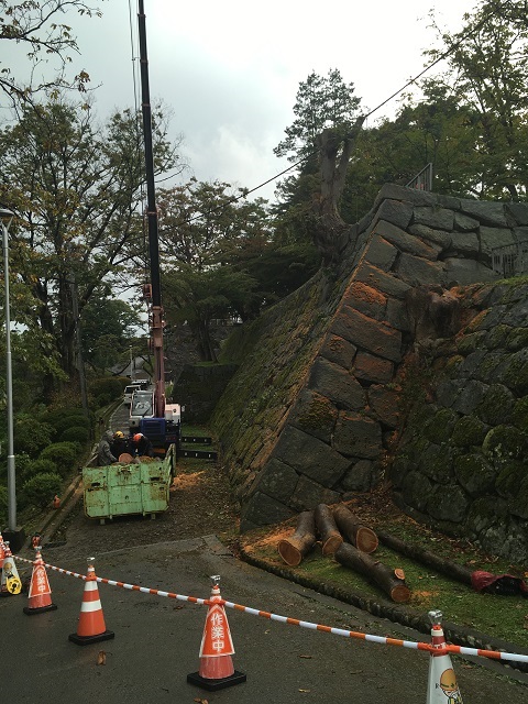 石垣に聳えた欅を伐採している写真です。でも、廃棄処分するのだそうです・・・勿体ないですよねー、石垣ですから、当然盛岡城跡地で育った欅なのです。誰か盛岡市に提言して欲しいものです。もしくは、当方に廃棄処分業者の代わりに下取りさせてくれれば、経費削減にもなる筈です・・・納税者としては、この欅をお金をかけて、捨てるのは、勿体ないと云うしかありません。