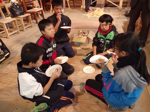 先週の27日の久保小学校木工教室の風景追加させていただきます。まずは、私が大工さんを紹介しているところと、鉋掛け体験中のところ、皆で石窯焼きピザを食べている写真です。私たちも楽しくていい思い出になりました。