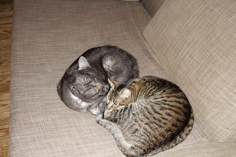 我が家の三匹の猫のうちの二匹です。名前は黒いのがサトでキジトラがナツもう一匹は写真にはいませんが、、ハルと言います。