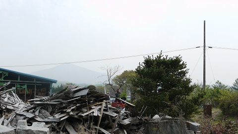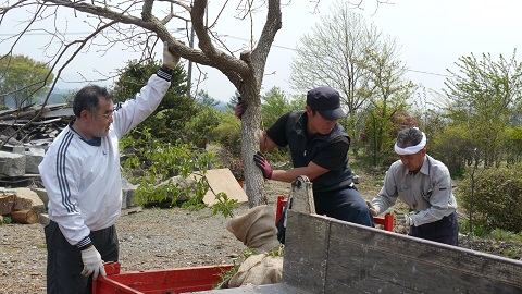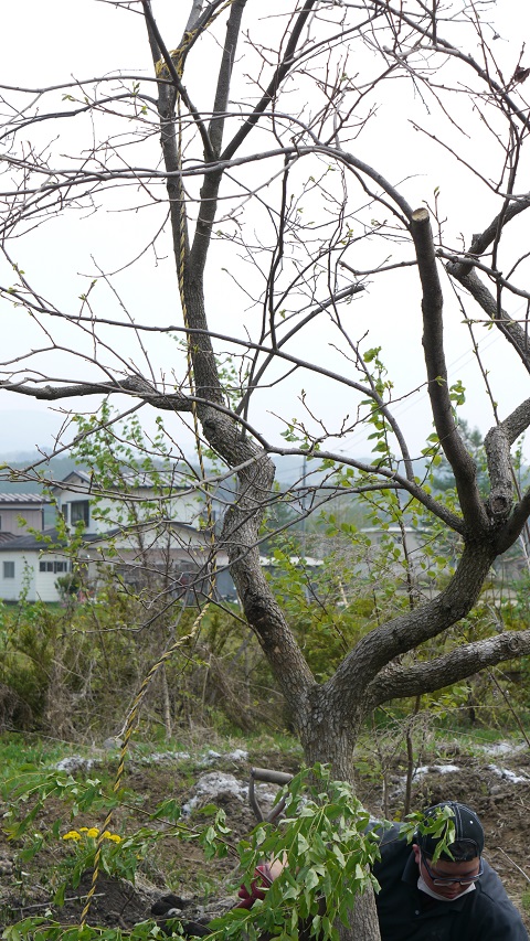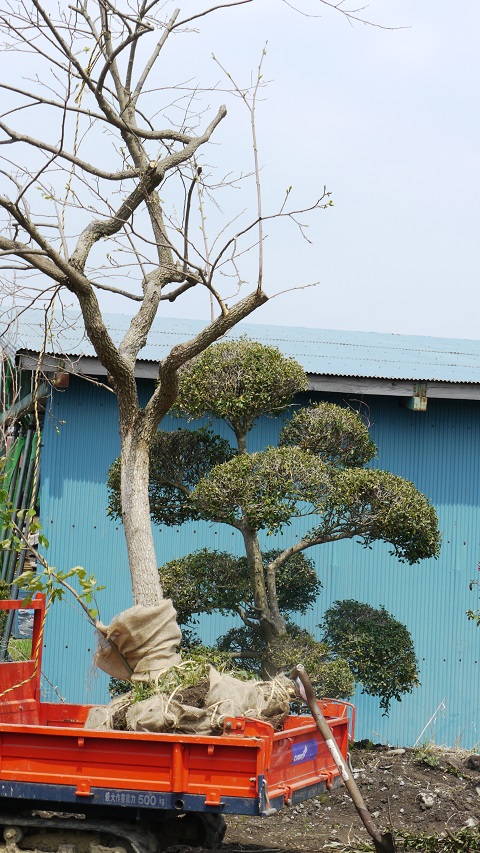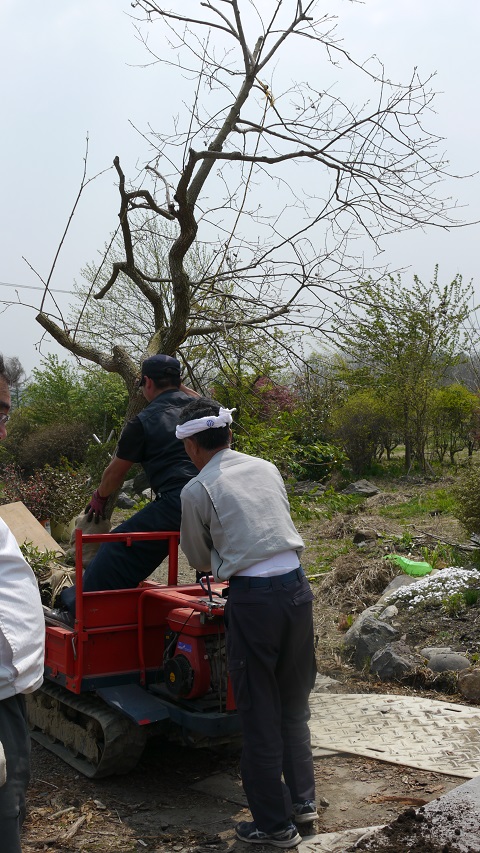 岩手町の改修」現場からの移植の柿の木を搬送して植え込む風景です。