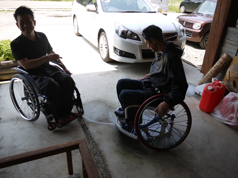 車椅子バスケ用の車椅子に初乗りしてみてスムーズさに驚いている高橋と、それをみて楽しんでいる大和田です。