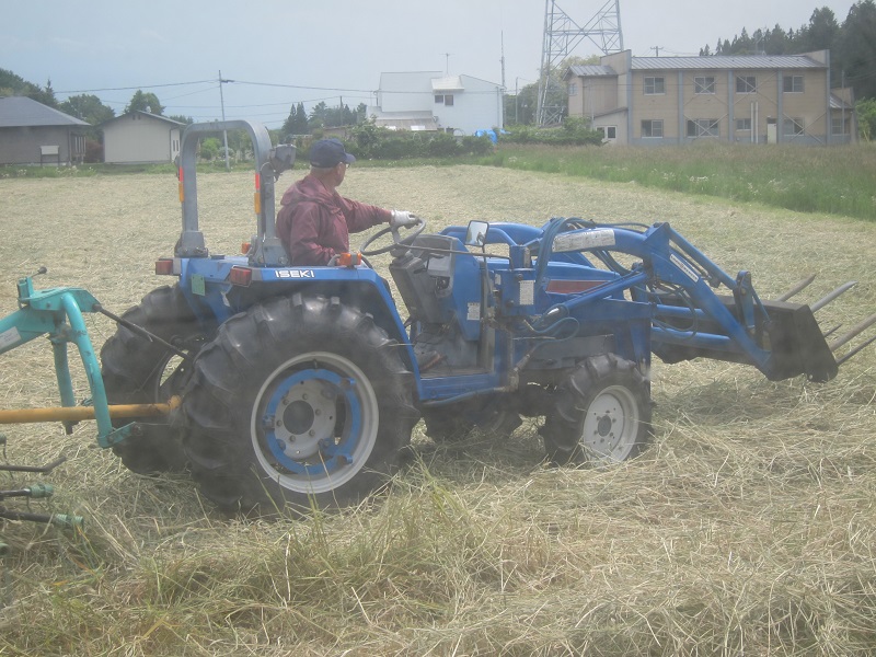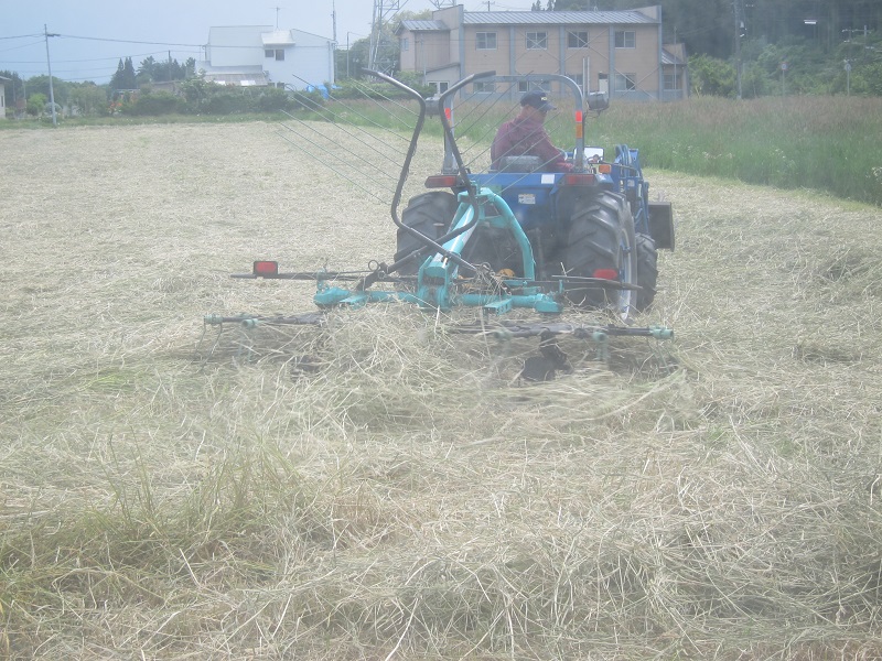 これもいつもの風景です。牧草の刈り取り作業ですね。